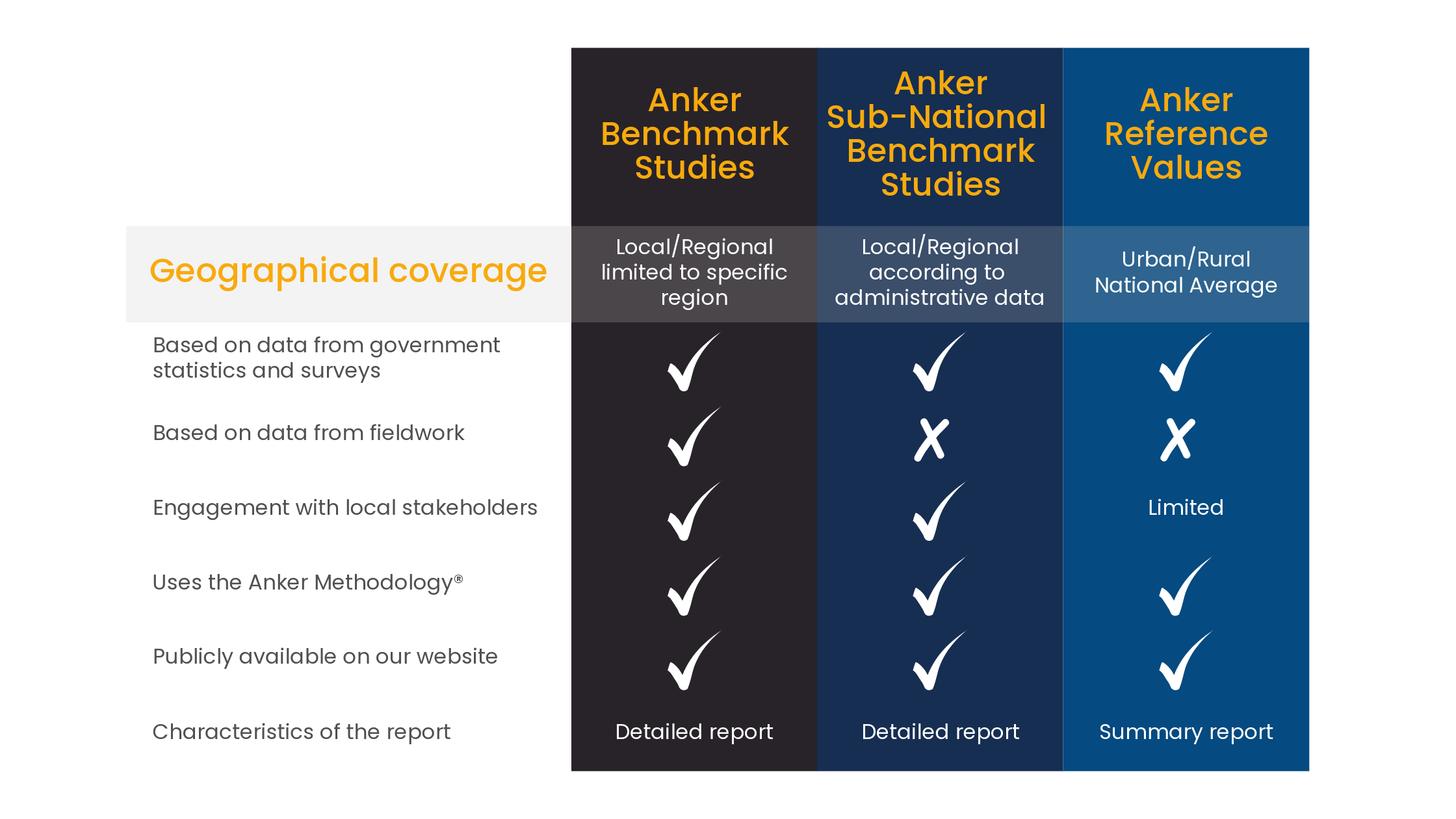 There are three types of studies that enable the Anker Research Institute to make internationally comparable living wage and living income estimates for countries and locations around the world: Anker Benchmark Studies, and Anker Sub-National Benchmark Studies, and Anker Reference Value Studies. All three use the Anker Methodology®. The main difference between traditional Anker Benchmark studies and Anker Sub-National Benchmark studies is the degree to which primary data are used. Traditional Anker Benchmark Studies always include primary data collection. Sub-National Studies usually rely exclusively on secondary data sources; however, they sometimes collect primary data to check on the accuracy of the secondary data. Reference Value studies rely exclusively on secondary sources.